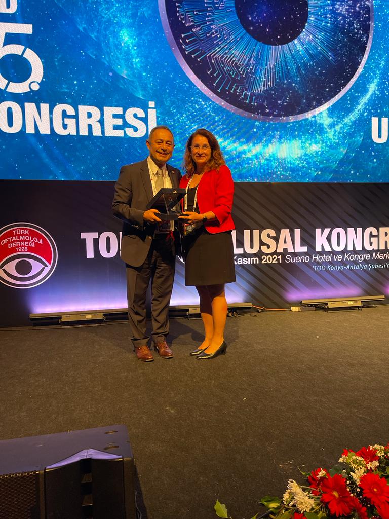 Fakültemiz Cerrahi Tıp Bilimleri Bölümü Göz Hastalıkları Anabilim Dalı Öğretim Üyesi Prof.Dr.Nazmiye EROL 'un Danışmanı olduğu Dr.Kübra KÜÇÜKİBA’nın ‘‘Yaşa Bağlı Makula Dejenerasyonu Olan Hastalarda Periferal Retina Değişikliklerinin Ultra-geniş Açılı Fundus Otofloresans Görüntüleri ile Değerlendirilmesi’’ isimli tez çalışmasının Türk Oftalmoloji Derneği 55. Ulusal Kongresi’nde ‘‘En İyi Yayın İkincilik Ödülü’’almaya hak kazanmıştır. Öğretim Üyemizi tebrik eder, başarılarının devamını dileriz.